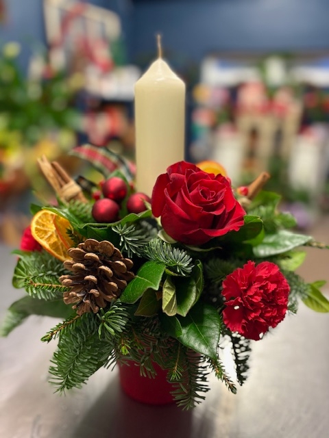 Designed by our team in a ceramic containter and using noblus ( Christmas tree) foliage as a base with berried ivy, cinnamon sticks, orange slices, cones and beautiful Christmas themed flowers to finish.