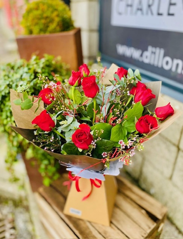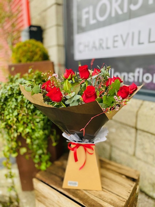 12 long stemmed beautiful red roses, sitting amongst stems of waxflower, eucalyptus and glossy greenery.