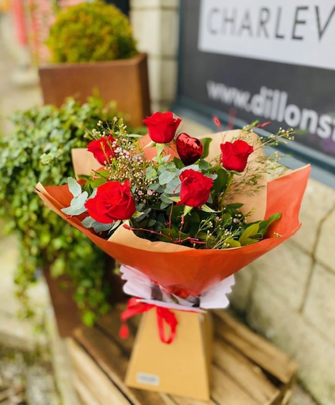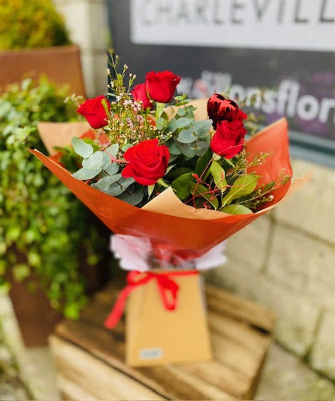 This bouquet includes 6 long stemmed red roses which are hand crafted by our florists with greenery, eucyluptus and waxflower. Having carefully wrapped these stems with our eco paper wrap, it is finished with a water resevoir and a craft living vase. A narrow satin bow is the final touch.