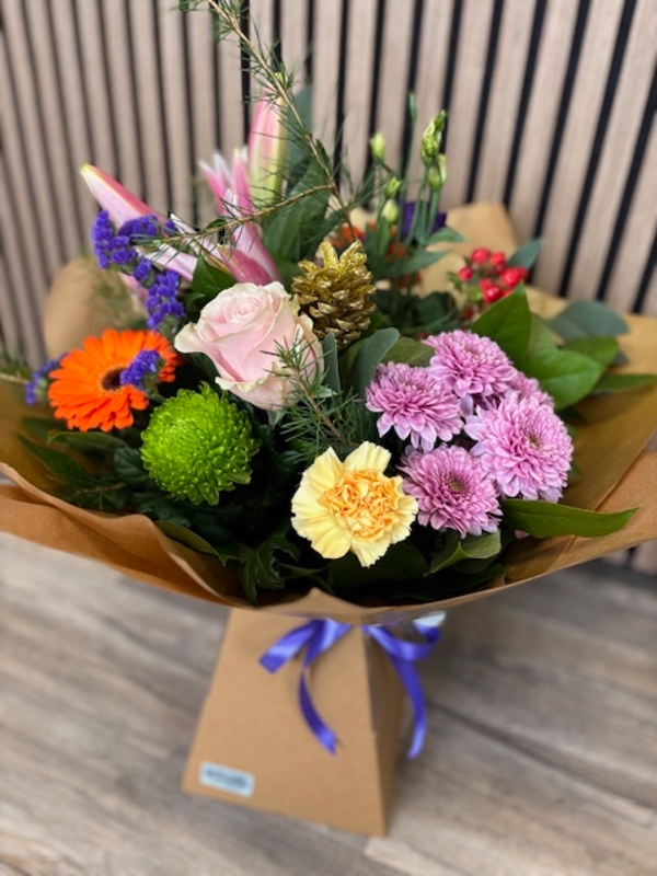 Using a jewel theme we mix pinks, oranges, purples and golds as we create this beautiful handtied bouquet for your loved one.